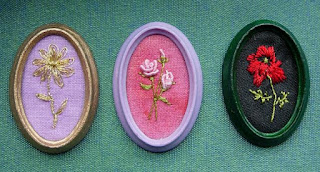 Thee little miniature embroideries, Goldwork Flower, Bullion Knot Roses & Satin stitch Poppy.